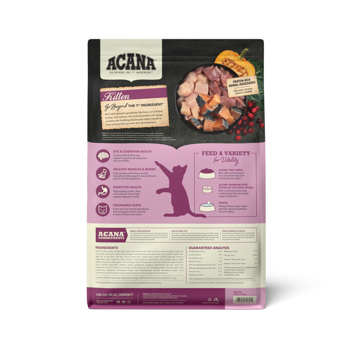 ACANA Highest Protein Free-Run Chicken, Turey, & Salmon Dry Kitten Food helps support the healthy development of your kitten. See your kitten grow up healthy and strong with protein-rich recipe crafted specially for their needs.Omega-3 and Omega-6 fatty acids help support healthy skin and a shiny coat and taurine, EPA and DHA help maintain eye and heart health. Fresh ingredients use refrigeration as the sole method of preservation. Raw ingredients are frozen at the peak of freshness to preserve nutrients. Choose ACANA cat food to give your companion the nutritional foundation they need to live a happy, healthy life.