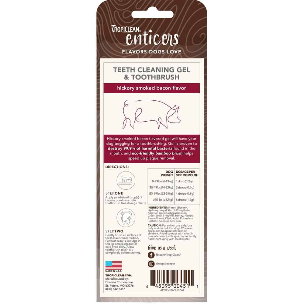Flavors Dogs Love - Hickory Smoked Bacon Flavor is 3x more appetizing to dogs than competing oral care gels. Clean Teeth Guaranteed - Gel helps eliminate 99.9% of the root cause of plaque and bad breath. Delectable Dental Care - It's no secret dogs hate teeth cleaning time, but now they will crave it! Bacony gel will satisfy their natural cravings and leave their teeth sparkling clean. Powerful Brushing Duo - When used with teeth cleaning gel, bamboo brush helps accelerate plaque removal. Eco-Friendly Brushing Solution - Bamboo toothbrush is made with soft bristles and a plant-derived handle. Pet Parent Approved - Gel is free from sulfates, parabens, dyes, and artificial colors, and is cruelty free. Packaging is recycleable. Family Owned - TropiClean Enticers are proudly made in the U.S.A by pet lovers just like you. Safe for use on dogs 12 weeks and older, when used as directed. TropiClean Pet Products offers a full range of naturally derived dog and cat products including TropiClean Grooming Products, TropiClean SPA by TropiClean, TropiClean OxyMed, TropiClean PerfectFur, and TropiClean Enticers and TropiClean Fresh Breath Oral Care and Dental Products. Contains one (1) 2oz bottle of TropiClean Enticers Teeth Cleaning Gel - Hickory Smoked Bacon Flavor and one (1) bamboo toothbrush for small/medium dogs.
