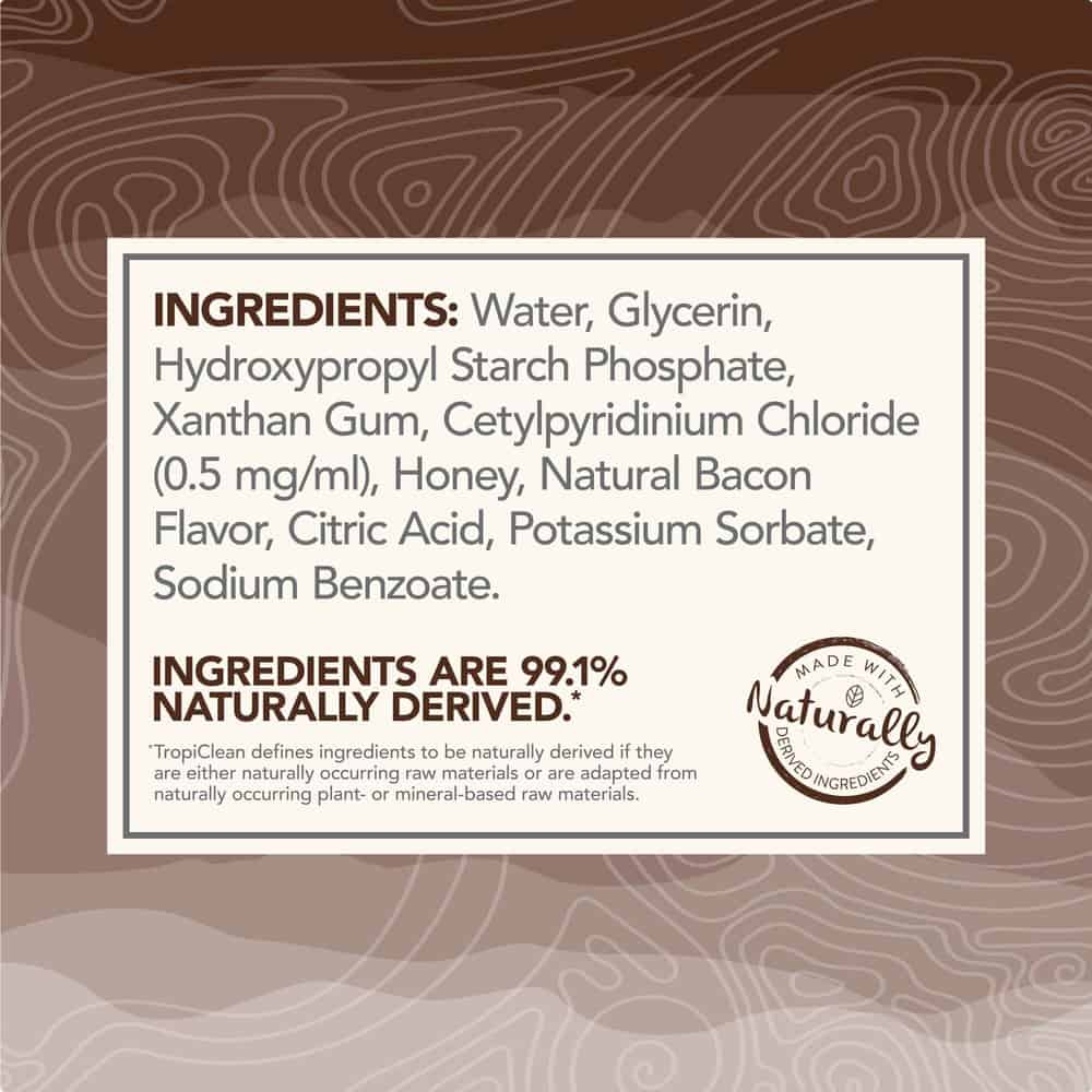 | Ingredients: Water, Glycerin, Hydroxypropyl Starch Phosphate, Xanthan Gum, Cetylpyridinium Chloride (0.5 mg/ml), Honey, Natural Bacon Flavor, Citric Acid, Potassium Sorbate, Sodium Benzoate. |