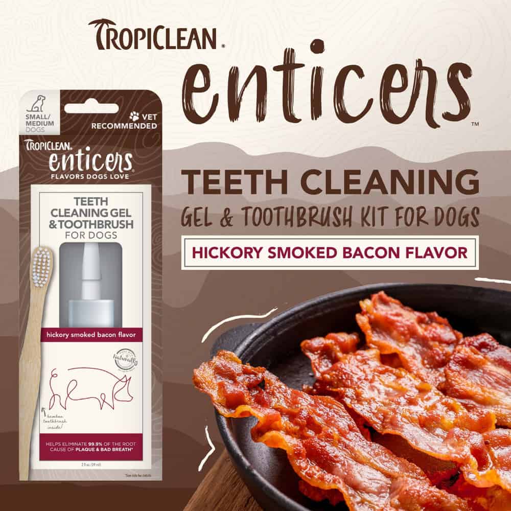 TropiClean Enticers Teeth Cleaning Gel - Hickory Smoked Bacon Flavor will have your dog begging for a toothbrushing.