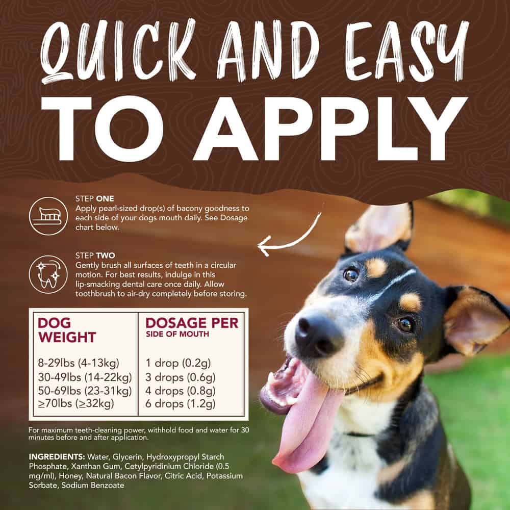 - Apply pearl-sized drop(s) of bacony goodness onto toothbrush (see dosage chart). Gently brush all surfaces of teeth in a circular motion. For best results, indulge in this lip-smacking dental care once daily. Allow toothbrush to air-dry completely before storing.