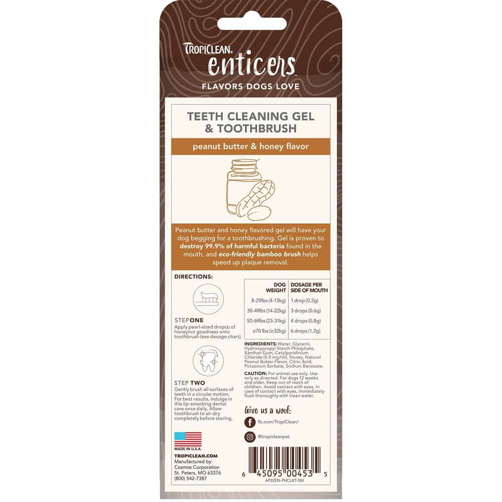 TropiClean Enticers Teeth Cleaning Gel - Peanut Butter & Honey Flavor will have your dog begging for a toothbrushing. The sweet, nutty flavors of peanut butter and honey will make toothbrush time your dog's favorite time. Gel is made with naturally derived ingredients and proven to help eliminate 99.9% of the root cause of plaque and bad breath. When used together, gel and included eco-friendly bamboo toothbrush help speed up the removal of pesky plaque and reduce bad breath. For tip-top teeth, brush once daily