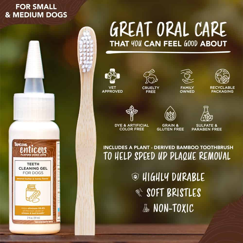 Safe for use on dogs 12 weeks and older, when used as directed. TropiClean Pet Products offers a full range of naturally derived dog and cat products including TropiClean Grooming Products, TropiClean SPA by TropiClean, TropiClean OxyMed, TropiClean PerfectFur, and TropiClean Enticers and TropiClean Fresh Breath Oral Care and Dental Products. Contains one (1) 2oz bottle of TropiClean Enticers Teeth Cleaning Gel - Peanut Butter and Honey Flavor and one (1) bamboo toothbrush for small/medium dogs