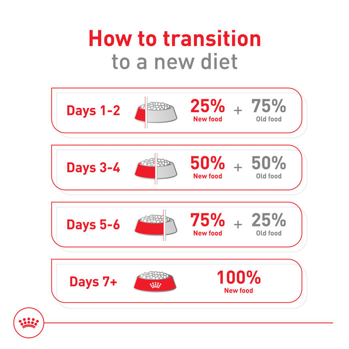 - Slowly moving your pet onto a new food over at least 7 days is recommended to ensure their comfort and help them adapt to their new food.