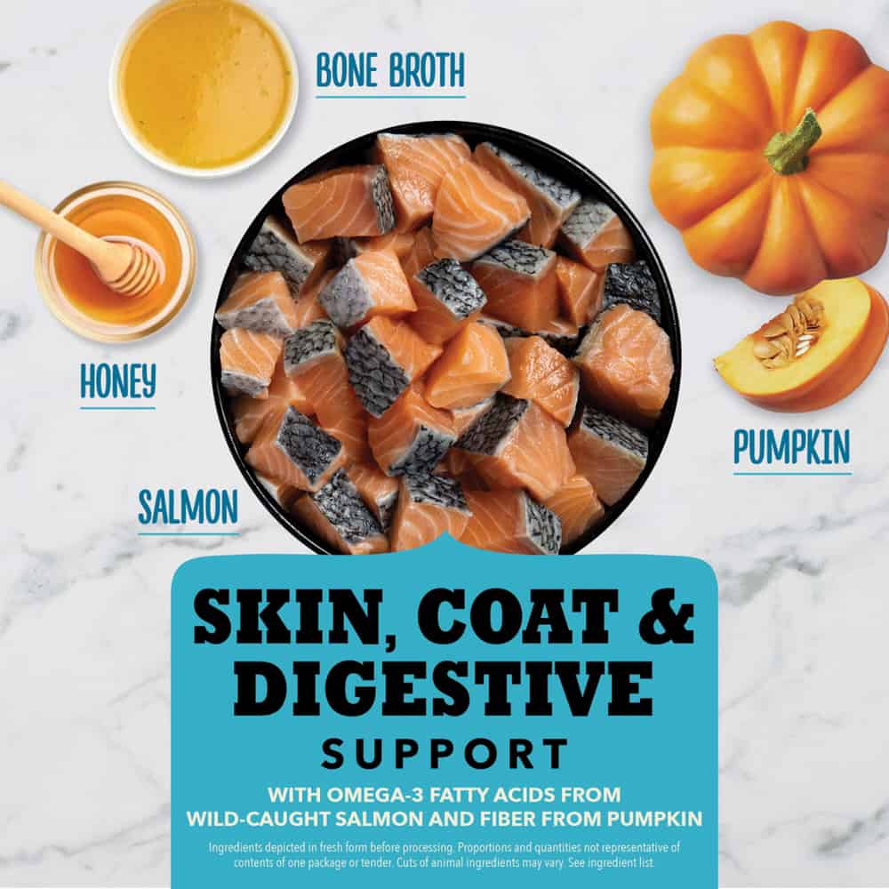 - High-protein dog treat recipe features wild-caught salmon and bone broth and is balanced to include 85 percent* animal ingredients